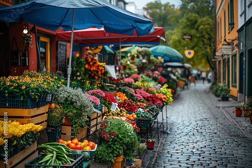 market, street, flower, vegetable, autumn, colourful, cobbled, stall, produce, plant, urban, city, fall, fruit, food, harvest, display, selling, shop, business, fresh, garden, seller, retail, agriculture, bloom, bouquet, chrysanthemum, dahlia, gerbera, marigold, rose, tulip, vegetable, tomatoes, pepper, cucumber, green, red, yellow, orange