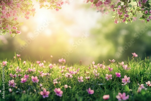 Colorful flowers bloom under a bright sun during a joyful Easter celebration in spring