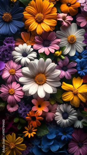 Colorful flowers when viewed from above Flowers of many different colors and types, with purple, yellow, white and pink appearing everywhere. It will be used as wallpaper.