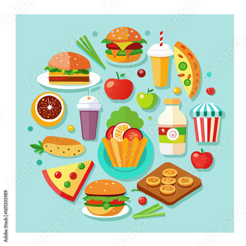 food, pizza, burger, fries, hot dog, steak, soup, salad, tomatoes, lettuce, plate, meal, snack, accessing, dish, cooking, cookery, epicure, culinary, breakfast, lunch, dinner, fast food, healthy, unhealthy, tasty, deliciously, vibrant, colourful, delicious, fresh, spicey, greasy, grilled, baked, roasted, fried, cheesy, sauce, bun, meat, vegetarian, bowl, appetising, menu, modern, vector, graphic, stylised