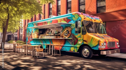 food, truck, street, urban, city, eatery, catering, mobile, cookery, delivery, service, seller, cart, eat, meal, lunch, dinner, snack, service, dining, cafes, kitchen, lifestyle, culture, design, life, city landscape, business, parking, sidewalk, pavement, table, chair, building, window
