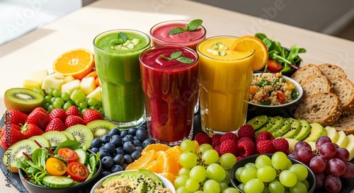 Colorful Fruit and Vegetable Smoothie Platter | Healthy Food and Drink Arrangement for Wellness, Diet, and Lifestyle Marketing