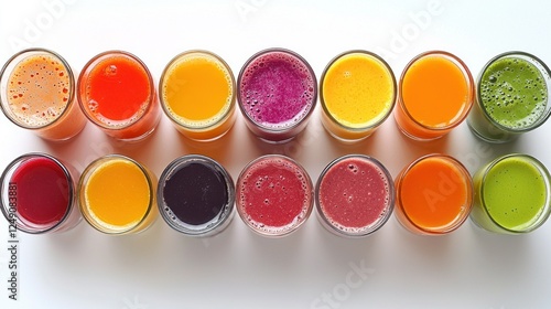 Colorful fruit juices in glasses, arranged in rows on a white background, healthy drinks