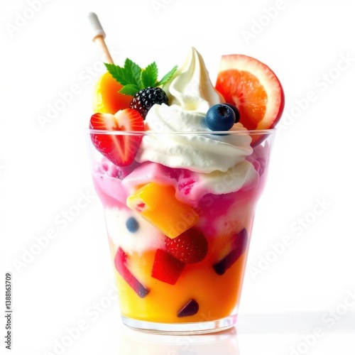 parfait, fruit, berry, citrous, tropical, whipped, cream, dessert, sweet, refreshing, colourful, layer, glasses, orange, strawberry, blueberry, blackberry, mint, food, treat, snack, delicious, fresh, bright, white, background, isolated, bowl, refreshment, spoon, topping, ice, glacé, confection, epicure, summer, seasonal, produce, ingredient, nourishment