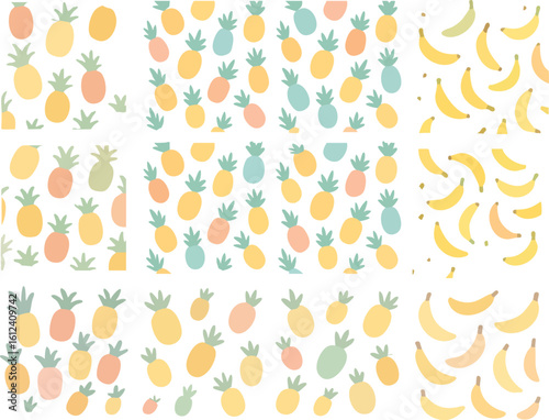 pineapple, banana, fruit, pattern, seamless, background, design, illustration, tropical, summer, food, yellow, green, pink, orange, blue, repeat, texture, wallpaper, print, textile, fabric, surface, decorative, fresh, healthy, diet, nourishment, sweet, ripe