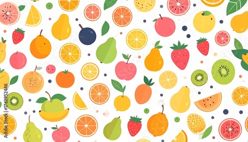fruit, orange, pear, apple, strawberry, kiwi, citrous, slice, pattern, food, fresh, healthy, tropical, background, design, illustration, sweet, ripe, vitamin, juicy, vegetarian, diet, nourishment, organic, natural, colourful, summer, texture, wallpaper, vibrant, delicious, ingredient, plant, leaf, round, circle, segment, half, whole, section, piece, cut, drawing, art, graphic, element, surface