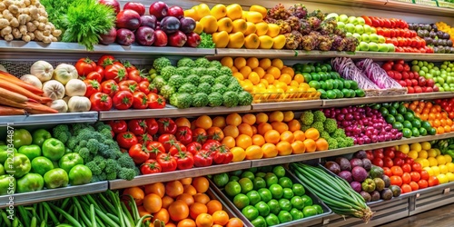 Colorful fruits and vegetables arranged artfully on a supermarket shelf, fruit bowl
