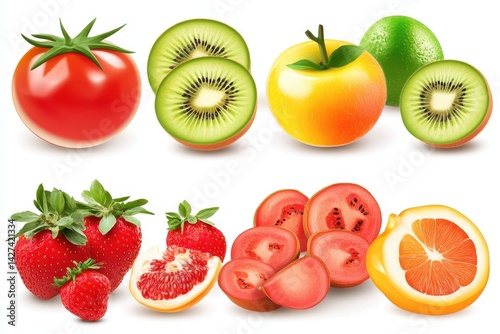 fruit, vegetable, tomatoes, kiwi, apple, lime, strawberry, grape, orange, healthy, diet, vitamin, nourishment, food, fresh, organic, natural, juicy, colourful, vibrant, sliced, healthy eating, receipe, vegan, vegetarian, cooking, ingredient, summer, spring, fall, winter, food photography, graphic design, illustration, digital artwork, realistic, cut, section, red, green, yellow, fruit basket, produce, vitamin c, potassium, digestion, healthy lifestyle