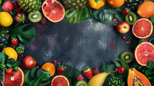 Colorful fruits border on black background - Vibrant, fresh assorted fruits beautifully arranged in a border on a dark backdrop, highlighting nature's candy in rich colors and textures