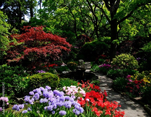 garden, path, flower, tree, blossom, plant, nature, lush, green, colourful, vibrant, spring, summer, beauty, tranquil, peaceful, scenic, landscape, japanese, asian, decorative, red, blue, purple, pink, stone, water, duck pond, sunlight, foliage