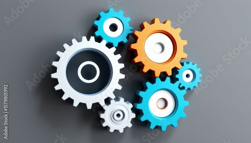 Colorful gears arranged in a dynamic composition on a gray background.
