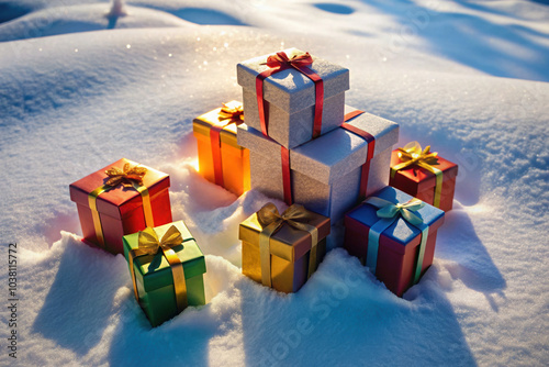 Colorful Gift Boxes on Snow Lit by Golden Sunset