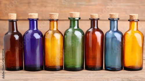 Colorful Glass Bottles with Cork Stoppers on Wooden Surface (1)