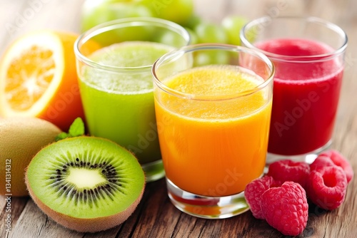 juice, fruit, glasses, fresh, healthy, drink, food, beverage, orange, kiwi, raspberry, grape, diet, vitamin, nourishment, colourful, table, wood, natural, organic, refreshment, detox, lifestyle, eating, vegetarian, vegan, health, wellness, ingredient, ripe, sweet, green, red, yellow, background, closeup, delicious, assorted, variety, summer, freshness, antioxidant