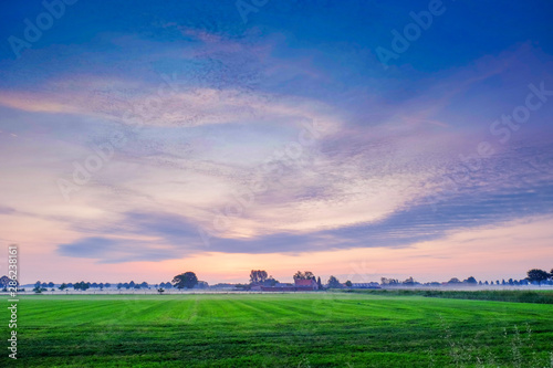 Colorful glowing sunrise over a countryside farming area, creating an idyllic scenic landscape