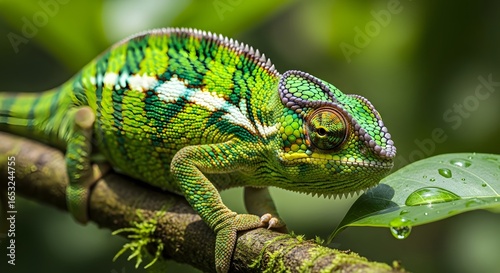 chameleon, green, colourful, exotic, reptile, animal, small, resting, tree branch, leaf, natural, jungle, rainforest, scale, bright, high-coloured, detailed, closeup, macro, sharp, lighting, natural light, wildlife, nature, biodiversity, fauna, vertebrate, tropical, habitat, reptilian, camouflage, vivid colors, moisture, dew-drop, lush, greenery, environment, conservation