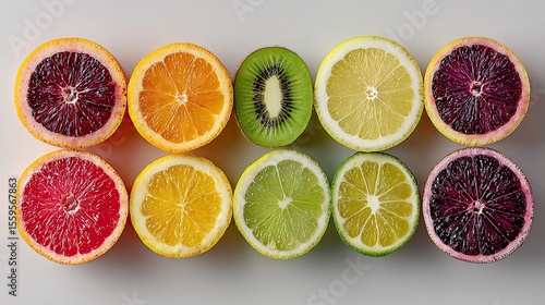 Colorful halves of tropical fruits arranged on white background for clean eating, food photography, and freshness