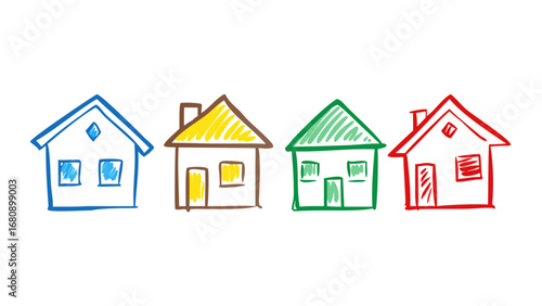 house, hand-drawn, icon, red, blue, yellow, green, brown, simple, childlike, doodle, vignetting, building, home, residential, illustration, graphic, design, art, drawing, cartoon, colourful, collection, set, isolated