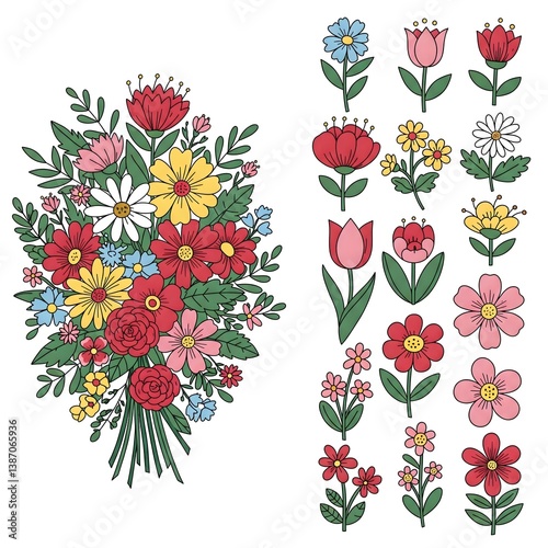 Colorful Hand-Drawn Floral Bouquet and Individual Flower Clipart Set