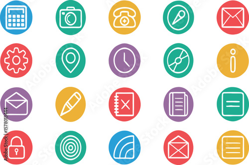 icon, hand-drawn, doodle, vector, graphic design, illustration, collection, set, symbol, calculating machine, camera, phone, location, time, clock, cd, information, mail, setting, gear, lock, notepad, crayons, communication, signal, electronic mail, interface, design element, web design, business, concept, circle, colourful, white background, isolated, app