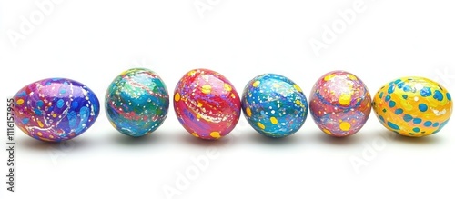 Colorful handmade Easter eggs in vibrant patterns arranged on a white background showcasing unique artistry and craftsmanship.