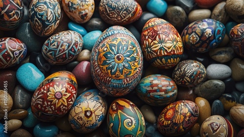 egg, decoration, art, ornate, design, colourful, pattern, holiday, craft, tradition, nature, background, celebration, spring, creative, surface, culture, hand-made, festive, closeup, seasonal, stone, vibrant, visual, unique, texture, arrangement, artistic, detail, bright, ornamental, religious, joy, beauty, exhibit, palette, natural, heritage, symbol, custom, lively, gathering, display, warmth, style