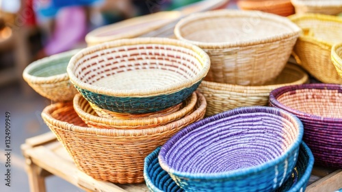 Colorful Handwoven Baskets Stacked Together at Local Market
