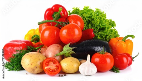 vegetable, fruit, healthy, food, organic, fresh, produce, colourful, vibrant, red, yellow, orange, green, purple, tomatoes, pepper, potato, aubergine, lettuce, garlic, herb, dill, spice, pile, bounty, assortment, ingredient, cooking, cookery, diet, nourishment, vitamin, antioxidant, healthy eating, display, studio, still life, food photography, natural, ripe, fresh produce, wholesome, harvest, balanced, delicious