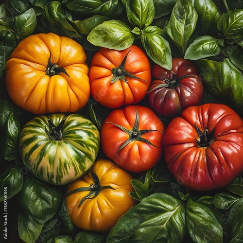 tomatoes, heirloom, basil, vegetable, fresh, organic, healthy, food, cooking, receipe, kitchen, colourful, vibrant, summer, autumn, fall, harvest, produce, display, epicure, delicious, italian, italian food, mediterranean, farmers market, farm, gardening, growing, ripe, juicy, red, orange, yellow, green, purple, dark, light, closeup, topview, photo, image, picture, still life, food photography, seasonal, ingredient, nourishment