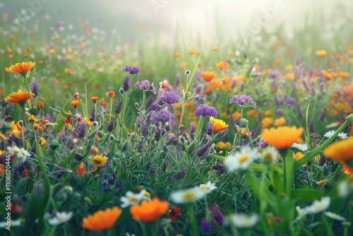 Colorful herb meadow with purple phacelia orange calendula chamomile.