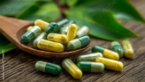 Colorful herbal capsules arranged on a wooden spoon with green leaves.