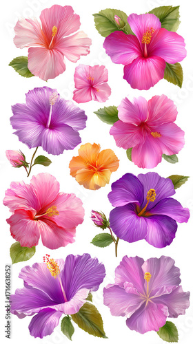 hibiscus, flower, colourful, botanical, floral, illustration, pink, purple, orange, flower petals, green leaf, nature, decorative, background, vibrant, artwork, garden, tropical, floristry, summer, blooming, natural, creative, design, realistic, beautiful, light, fresh, closeup, composition, art