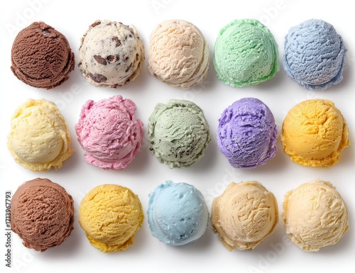 ice cream, scoop, colourful, tasty, sweet, glacé, dairy, dessert, ball, round, topview, grid, pattern, variety, delicious, food, summer, treat, refreshing, chocolate, vanilla, strawberry, mint, purple, yellow, pastel, light, bright, patterned, isolated, white, background, food photography, creamy, mouth-watering, sweetness, indulgence, cool