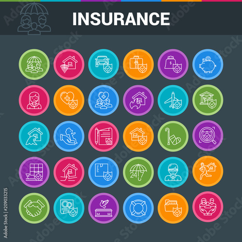Colorful icons set on theme insurance. Insurance of life, house, money, health, car. Vector illustration