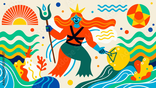 goddess, sea, illustration, trident, wave, colourful, water, art, ocean, fantasy, character, creative, vibrant, artwork, coral, marin, mythical, nature, joyful, playful, cartoon, underwater, bright, shape, abstract, summer, sun, ocean life, colours, cheerful, design, fantasy art, fun, concept, childlike, imaginative, marine life, aquatic, storytelling, whimsical, digital artwork, creativity, children