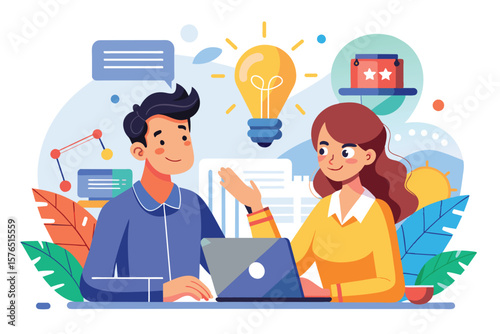 Colorful illustration of two people engaging in a creative brainstorming session. Symbols represent innovation, teamwork, and ideas in a dynamic, modern style.