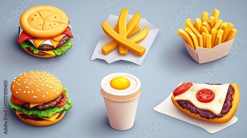 colourful, meal, fast food, menu, delicious, appetising, cartoon, fries, healthy, design, eatery, foodstuff, graphic, tasty, sandwich, realistic, icon, deliciously, food, lunch, illustration, fast, three-dimensional, snack, modern, isolated, unhealthy, dinner, breakfast, burger, pizza