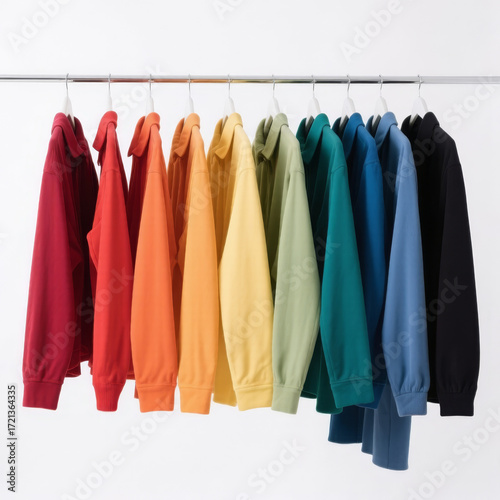 Colorful jackets hung in rainbow order on clothing rack in modern closet