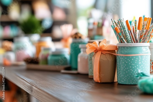 colourful, jar, collection, wooden, table, stationery, decorative, element, gift, ribbon, straw, polka, dot, vibrant, container, jar, desk, organised, pastel, arrangement, accessory, decor, art, craft, party, supply, storage, bright, workspace, workshop, creative, layout, interior, design, tool, item, cheerful, tabletop, neat, tidy, festive, cardboard box, display, lively, home, organisation