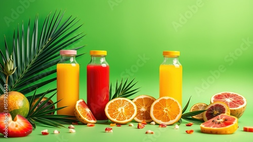 Colorful Juice Bottles with Tropical Fruits & Palms - Fresh Summer Drink