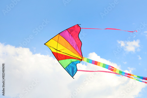 Colorful kite flying in blue sky on sunny day