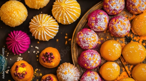 Colorful Laddu Sweets on a Plate for Holi Indian Festival Celebration.