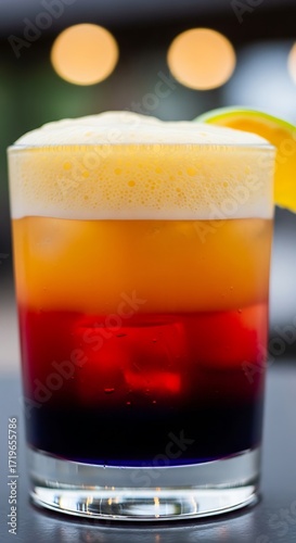 cocktail, drink, beverage, alcohol, alcoholic, liqueur, spirit, booze, refreshment, juice, mixed, layered, colourful, vibrant, refreshing, cold, iced, foam, frothy, garnish, citrous, orange, slice, glasses, tumbler, bar, pub, eatery, barkeeper, receipe, party, celebration, happy, hours, nightlife, summer, tropical, sweet, sour, liquid, fluid, closeup, macro, bokeh, background, light, dark, red