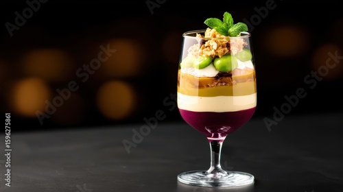Colorful layered dessert in a glass with fruits and toppings against a blurred background