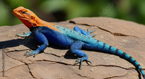 Colorful Lizard Orange Head Blue Body Resting on Brown Rock