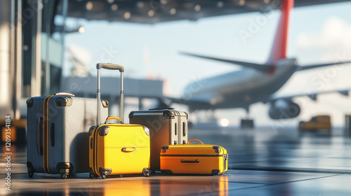 Colorful luggage collection awaits at the airport terminal with a blurred airplane in the background