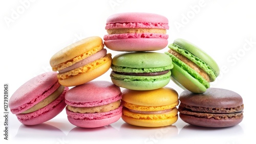 pastry, dessert, sweet, confectionery, colourful, stack, pile, arrangement, food, culinary, bakery, delicious, sweetmeat, confection, french, almond, meringue, filling, isolated, white, background, studio, photo, vibrant, pastel, colours, tasty, treat, closeup, detail, object, image, visual, graphic, design, element