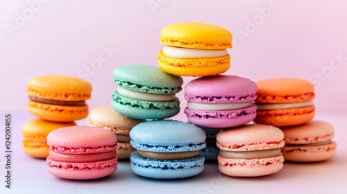 Colorful Macarons Stacked in a Sweet Delightful Arrangement on Display