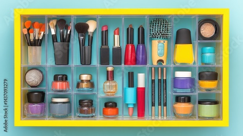 organisation, organiser, skincare, playful, make-up, presentation, cosmetic, trendy, vibrant, eyeshadow, display, tool, professional, surface, artistry, palette, grooming, brush, foundation, closeup, arrangement, modern, clean, container, style, attractive, fashion, nail polish, decorative, decor, colourful, beauty, bright, sorting, essential, flat, free space, lipstick