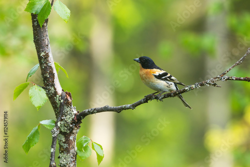 Colorful male Brambling perched on Birch during summer evening in Riisitunturi National Park, Northern Finland
